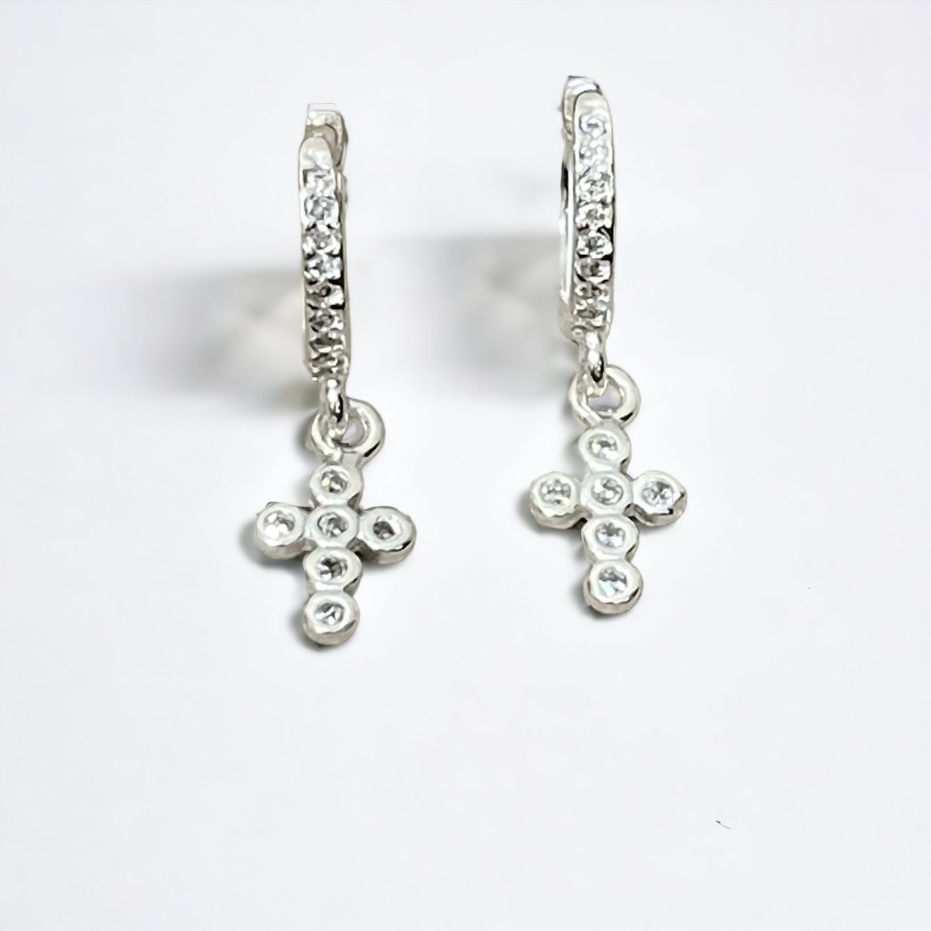Modelo:Brinco Argolinha e Cruz Pendurada Cravejada Prata 925